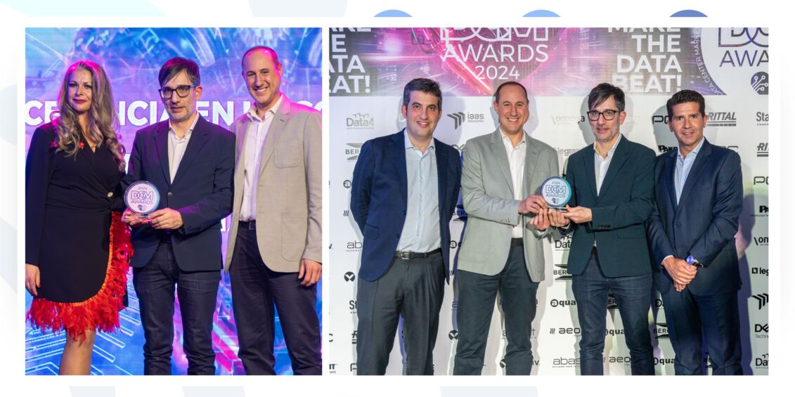 En la foto, Ignacio Fernández, Gerente de Infraestructuras de Europa y Gonzalo Coca, Site Manager del Hub de Derio, reciben el premio de manos de Iris Nieto de Data Center Market.