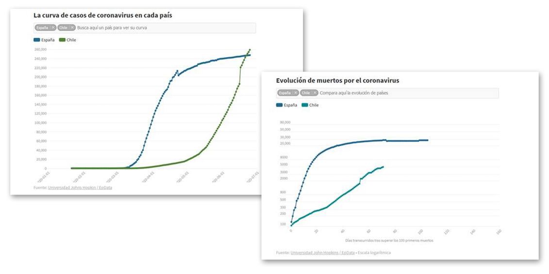 Así, si observamos las tendencias en España y Chile (y al igual que le sucedió a España en relación con países donde el problema se manifestó con anterioridad), podemos ver cómo, a pesar de todas las advertencias, con un decalaje aproximado de unos dos meses, las formas de la evolución son muy parejas. De hecho, quien es hoy el responsable del Ministerio de Salud, reconoció que, desgraciadamente, en Chile se hizo mucho énfasis en la detección, lo que funcionó relativamente bien, pero la trazabilidad tuvo mucha menos fuerza, y ello permitió que mucha gente portadora del virus lo continuara diseminando. “En la región metropolitana hubo un 14% de la gente que salía igualmente, aunque estuviese enferma”